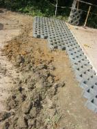 Kampf dem Matsch: Der Plattenweg nimmt Formen an. Harte Handarbeit mit weichem Lehm (August 2013) - und fast fertig im September/fertig im Oktober